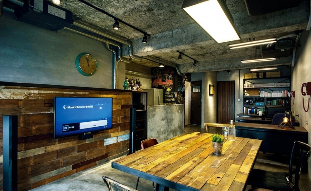 由于是將工作室結合臨時住宅的機能,方便兩人與同事工作之馀也能在這個空間休憩與沉淀,因此開放的格局及多元動線規(guī)劃是首要考量,將原本陽臺連結室內的隔間拆除,采用大面玻璃窗及采光罩,導入大量光線,加上貨柜門的大門,從這里就感受到粗獷隨興的工業(yè)風格;公共區(qū)域除了工作區(qū)外,設計師將原本在屋后端的廚房移到公共空間,用水泥粉光打造中島吧臺,營造出個性又原始的廚房,結合原木大餐桌的形式,讓這里成為員工開會及接待顧客的場域,也可以是休閑放松的客餐廳及聚會場所,廚房旁邊的客衛(wèi)隔間墻采用黑板漆打造涂鴉墻,設計師特別為客衛(wèi)打造一扇宛如監(jiān)獄門的門片,增加不少趣味性,也展現(xiàn)設計師的創(chuàng)意、風格及個性。