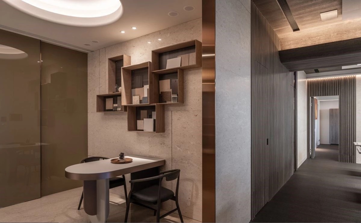 原本因?yàn)槠簲?shù)有限,無法容納兩間會議室,大幅減低日常的使用效率。設(shè)計團(tuán)隊靈光一動,在玄關(guān)入口的大理石立面旁,擺上一組時尚簡約的桌椅,便能滿足簡易的商務(wù)洽談,而上方也規(guī)劃開放式的格狀展示架,放置需要使用的材質(zhì)樣板,讓客戶看樣、討論圖面時,能夠更為便利順手。
