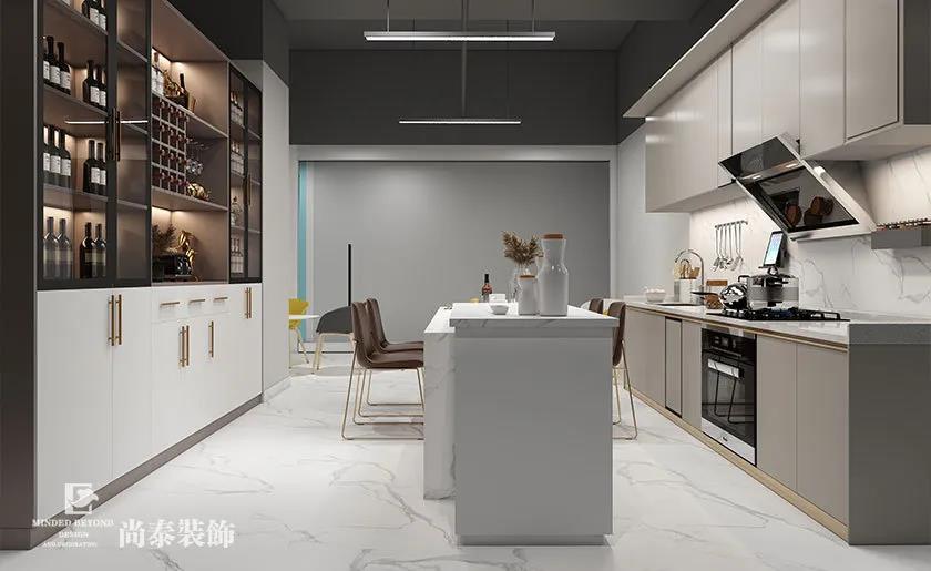 客戶非常注重風(fēng)水格局,因此設(shè)計(jì)師采用現(xiàn)代輕奢與傳統(tǒng)風(fēng)水相結(jié)合的設(shè)計(jì)理念。而這種理念在茶水間有所體現(xiàn),小到家私電器的朝向與擺放,大到空間的方位與分割,都嚴(yán)格遵循著風(fēng)水學(xué)原則。